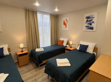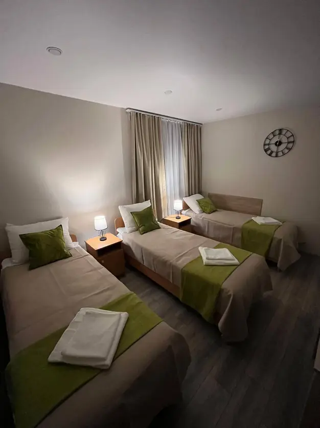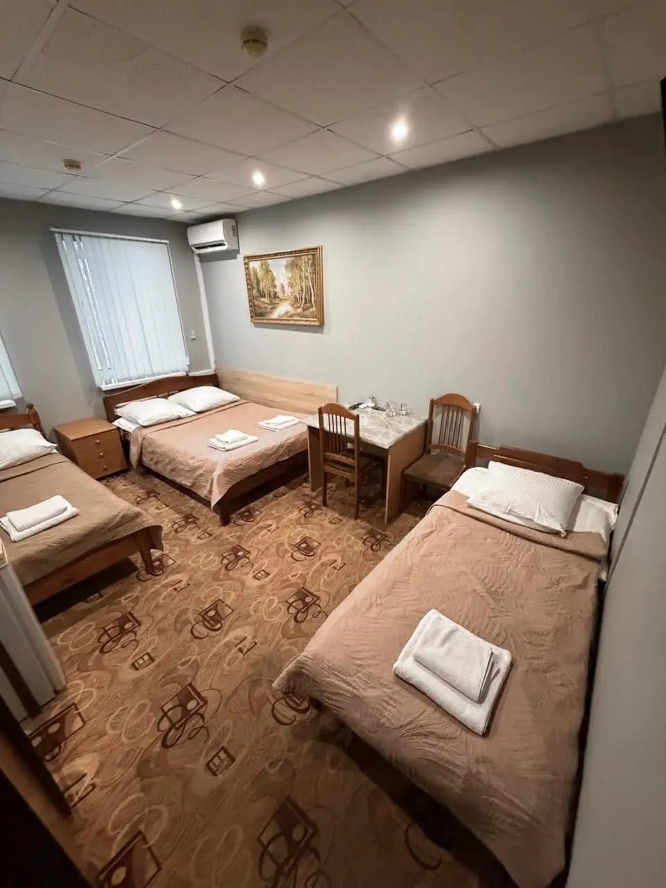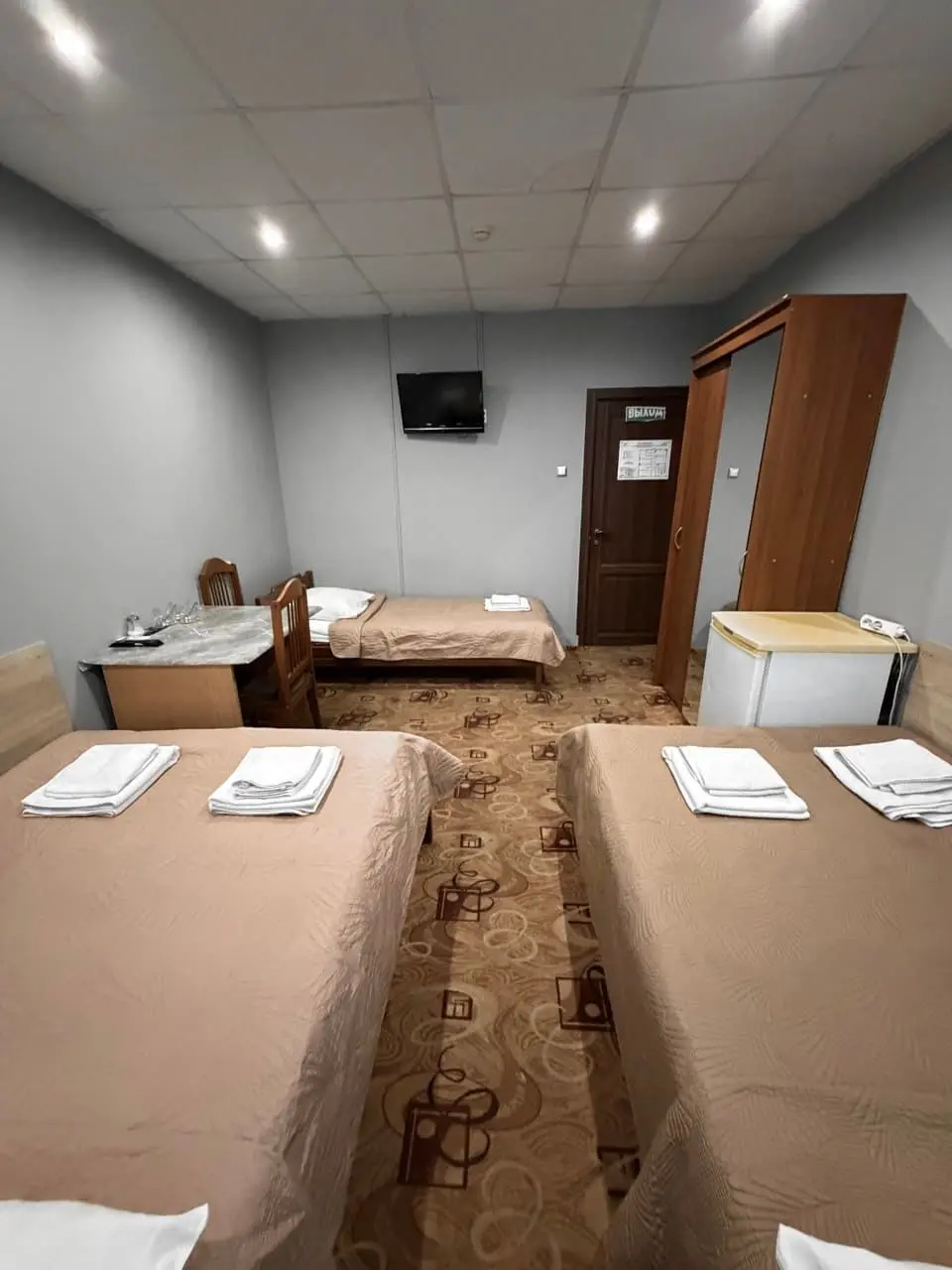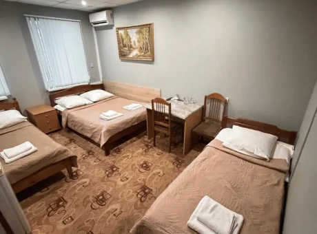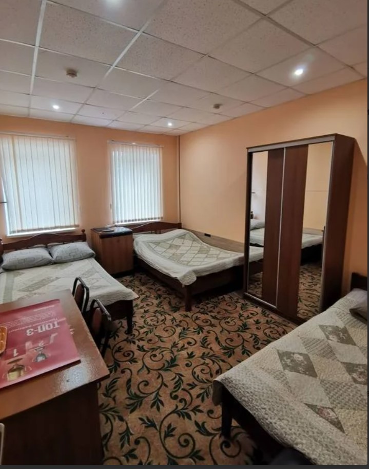 В номере: три раздельные кровати, стол, стул, телевизор, косметика для душа, полотенца, тапочки, WI-FI, кондиционер, шкаф-купе.