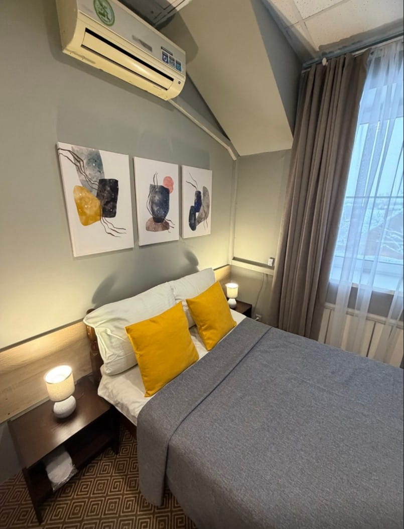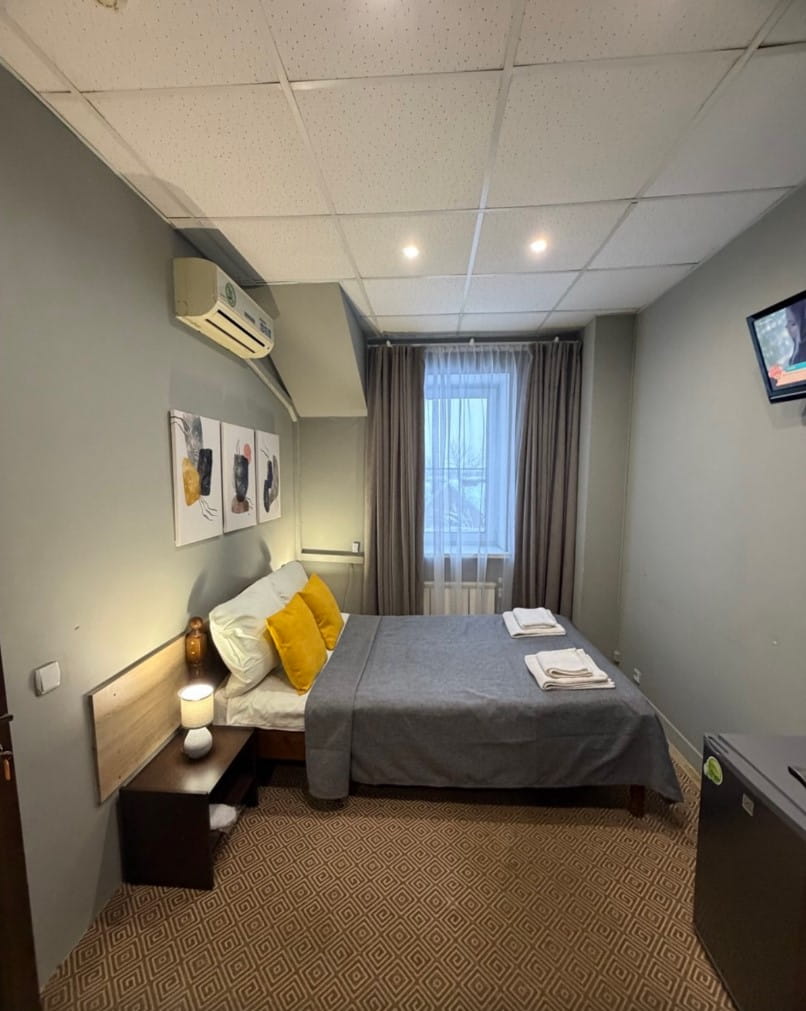 Одноместный номер стандарт с двухспальной кроватью собственным санузлом и душевой.