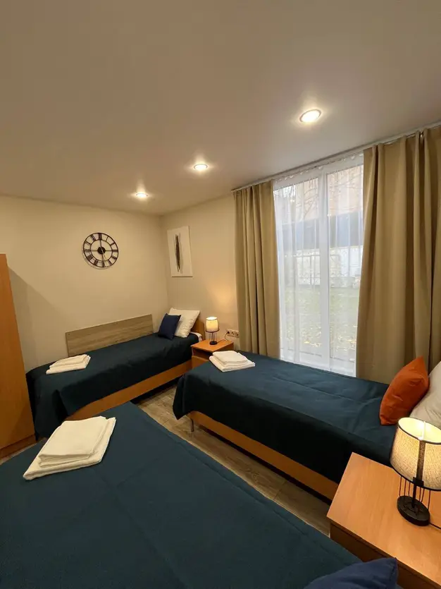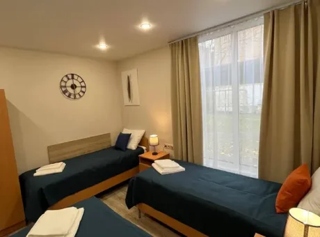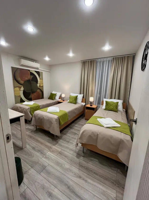 В номере: три раздельные кровати, стол, стул, телевизор, кухня, санузел ,косметика для душа, полотенца, тапочки, WI-FI, кондиционер, шкаф-купе.