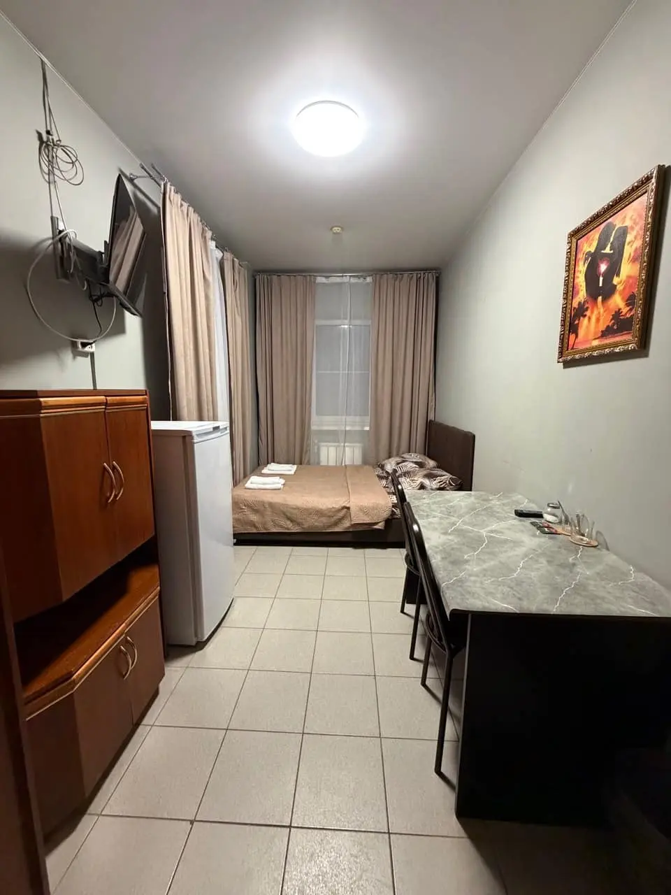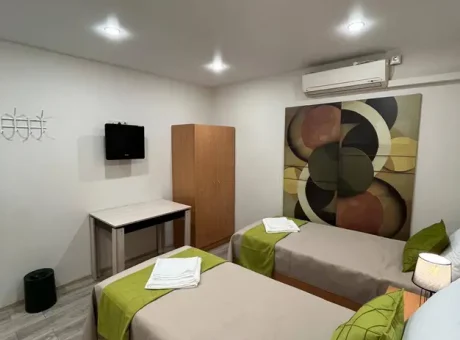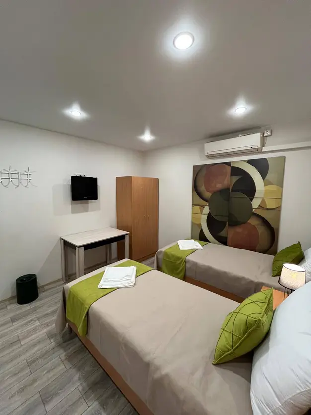 В номере: двухспальная кровать,стол, стул, телевизор, косметика для душа, полотенца, тапочки, WI-FI, холодильник, кондиционер