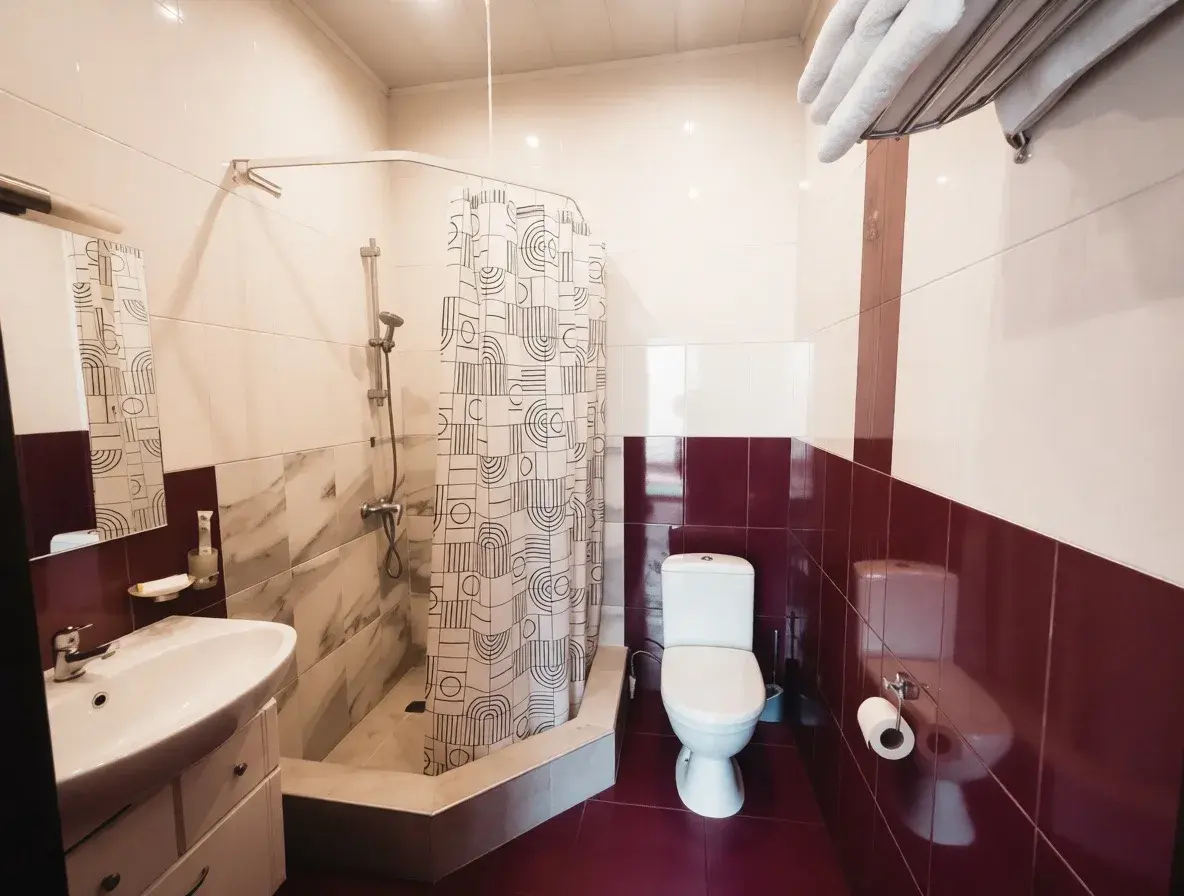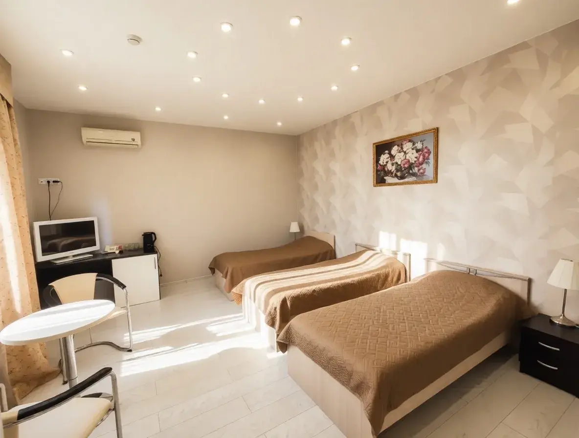 Просторный номер категории комфорт с собственной ванной комнатой, оборудованный тремя раздельными кроватями, прикроватными тумбочками, шкафом для одежды, обеденным и письменным столом, стульями, телевизором, средства личной гигиены, тапочки, постельное бельё, бесплатная парковка.
