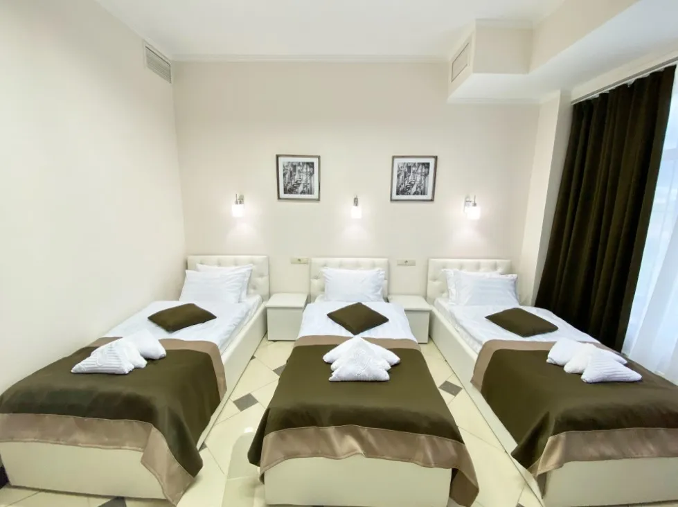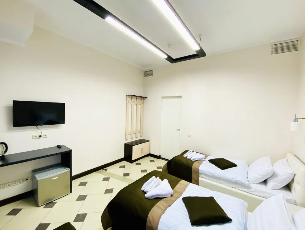 В номере: три одноместные кровати, холодильник, телевизор, набор для чаепития, полотенца
