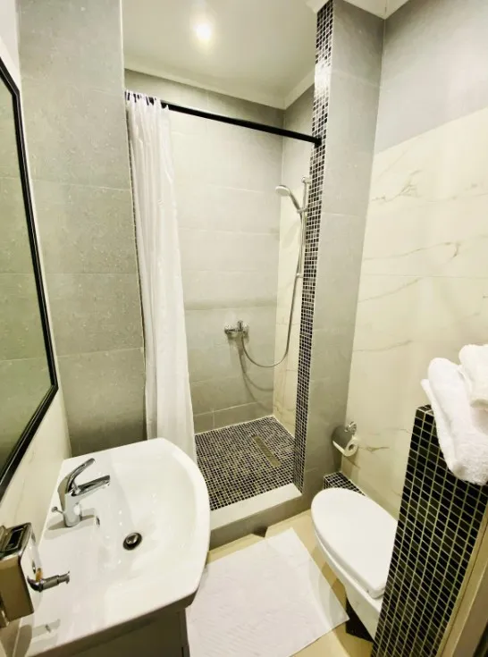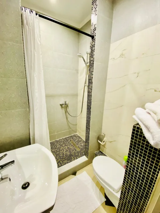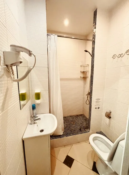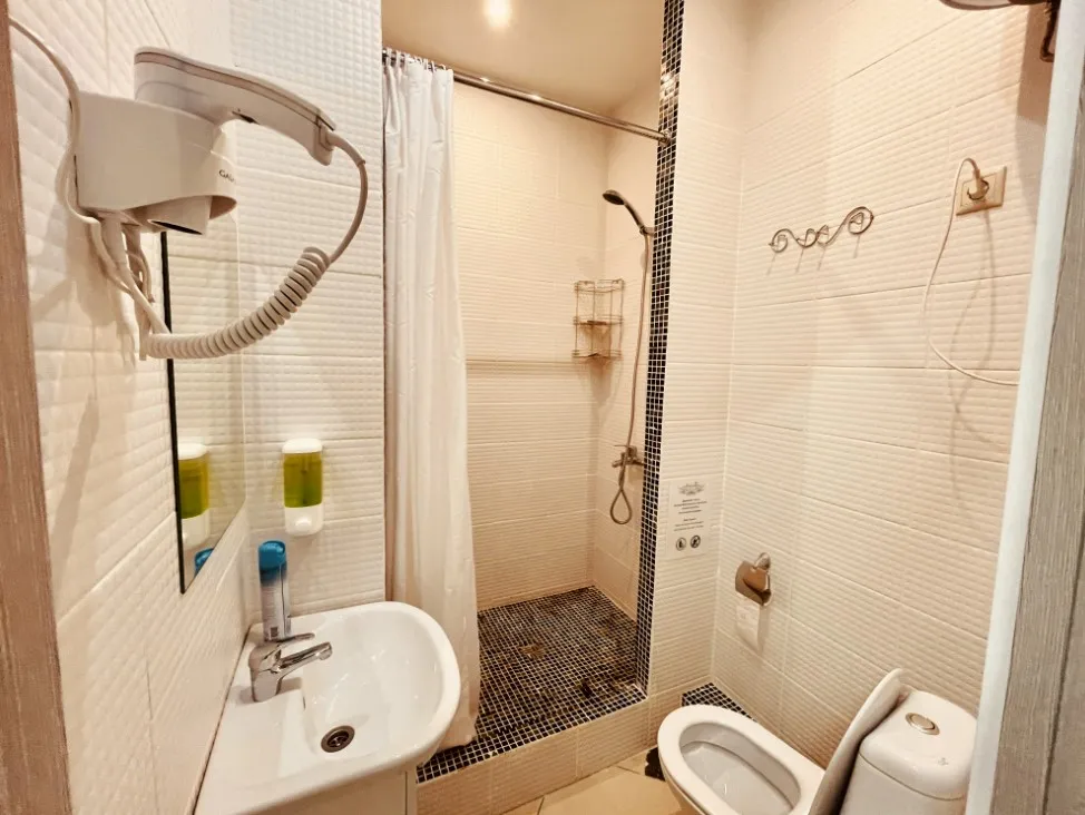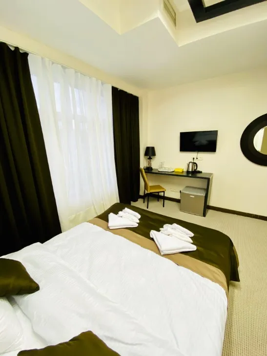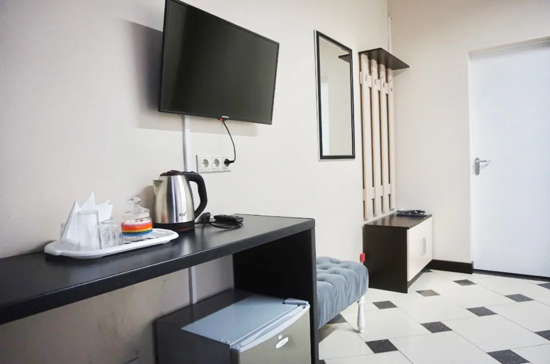 В номере: одна двухместная кровать, собственный санузел, принадлежности для душа, холодильник, телевизор, набор для чаепития, полотенца.