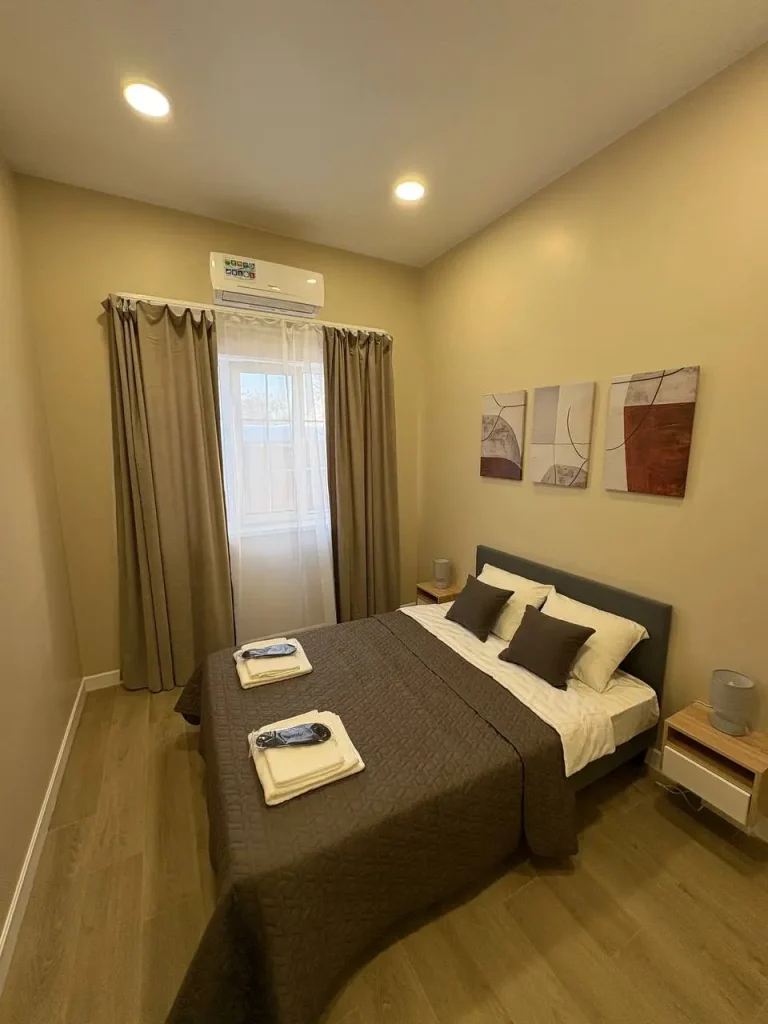 В номере: кондиционер, фен, рабочая зона, шкаф-купе, средства личной гигиены, тапочки, халаты, телевизор, одеяла, бесплатный wi fi. двухспальная кровать, прикроватные тумбы, чайник, стаканчики, бесплатное парковочное место.